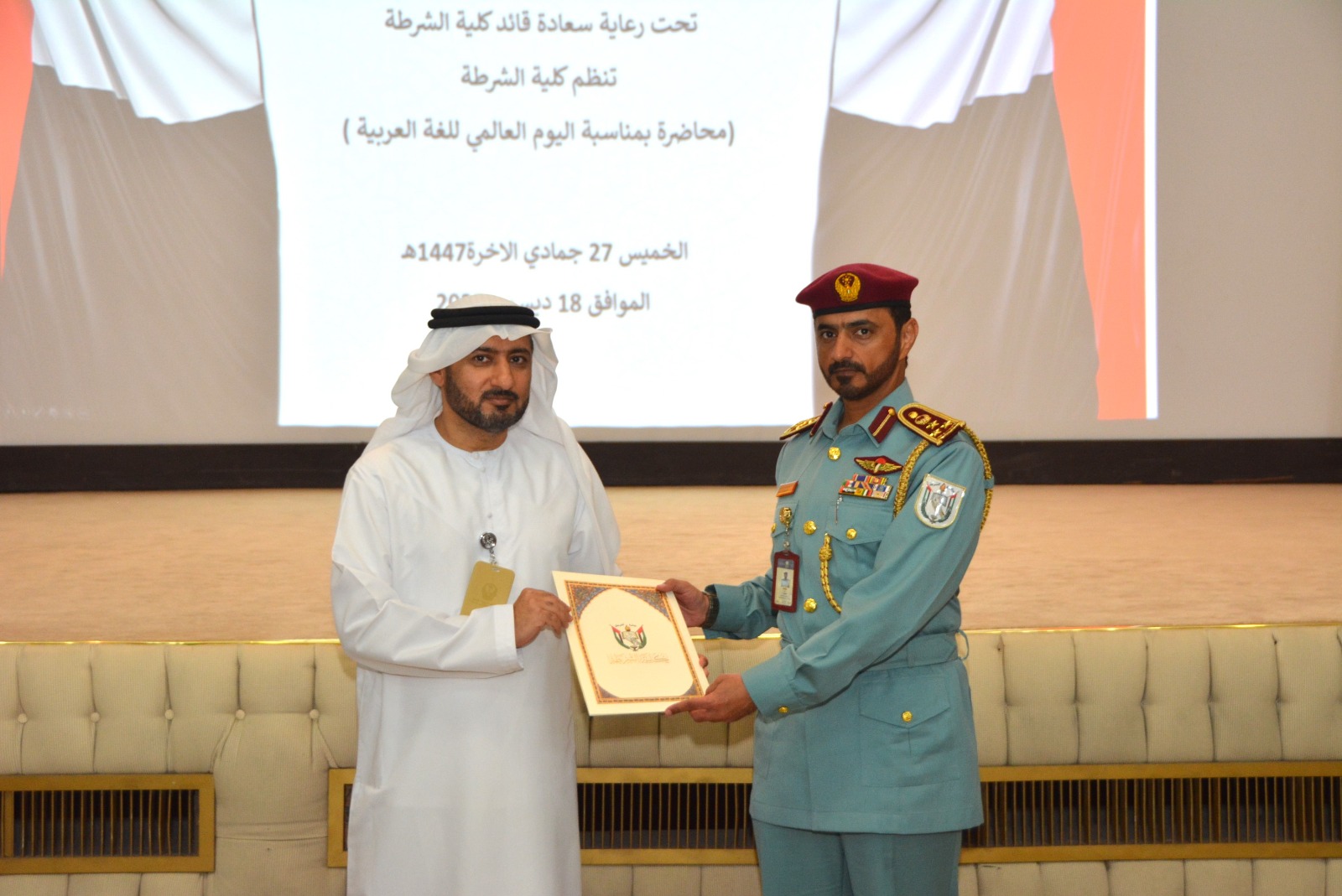 بمناسبة اليوم العالمي للغة العربية والذي يصادف 18 ديسمبر من كل عام وانطلاقا من حرص كلية الشرطة على الاعتزاز بلغتها وتعزيز مكانتها بين منتسبيها وطلابها، نظم قسم العلاقات والتوجيه بالتعاون مع مركز اللغة العربية احتفالية ألقى خلالها الدكتور/ علي عبد القادر الحمادي رئيس قسم مركز اللغة العربية محاضرة بين فيها مكانة اللغة العربية بين اللغات، وأنها أساس الهوية الوطنية ، كما تحدث عن مشاريع مركز اللغة العربية بكلية الشرطة لتعزيز اللغة العربية في وزارة الداخلية، مثل: التخطيط اللغوي، ومشروع الاستدامة اللغوية، ومشروع اللسانيات الجنائية.